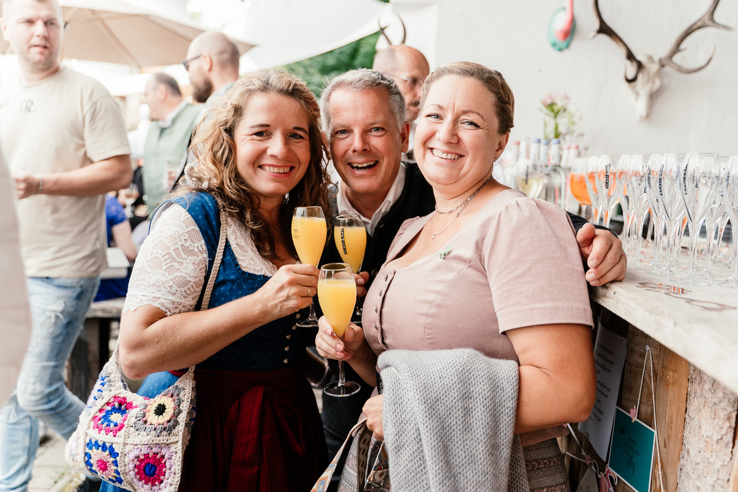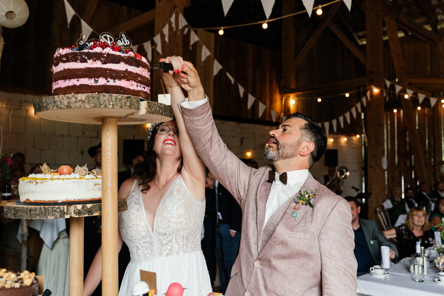 Nach der Trauung folgte der Sektempfang im Innenhof an der „Flamingobar“. Es herrschte eine wirklich schöne Atmosphäre und mein Brautpaar sowie die Gäste genossen das Beisammensein. Der nächste Programmpunkt war die Hochzeitstorte. Diese wurde in der Scheune serviert. Was für ein schöner Raum. Auch ging es dort schon los mit Musik und Tanz!